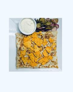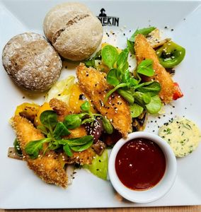 7. Sałaty z kurczakiem w chrupiącej panierce, warzywa z patelni, sos BBQ