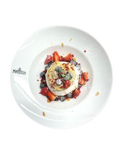 PAN.Pancakes z kawałkami czekolady, Kinder Bueno, mascarpone, owoce leśne, sos śmietankowy